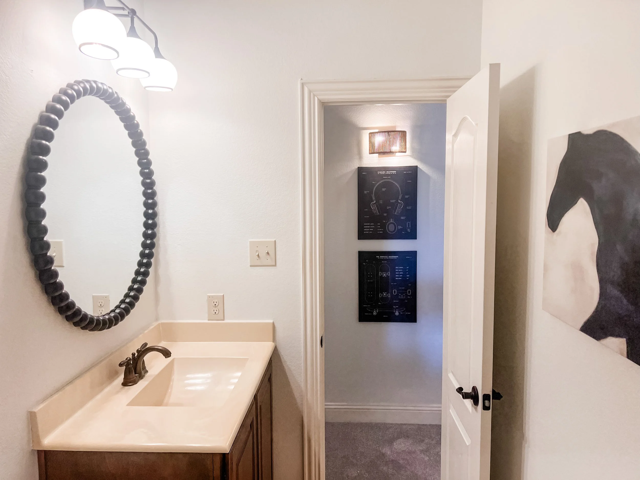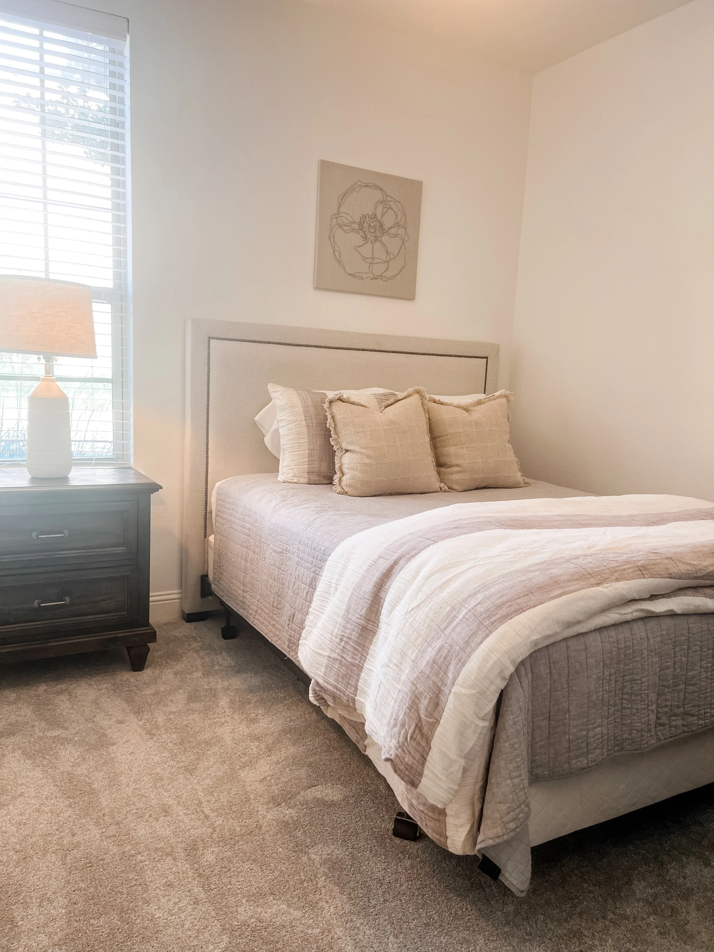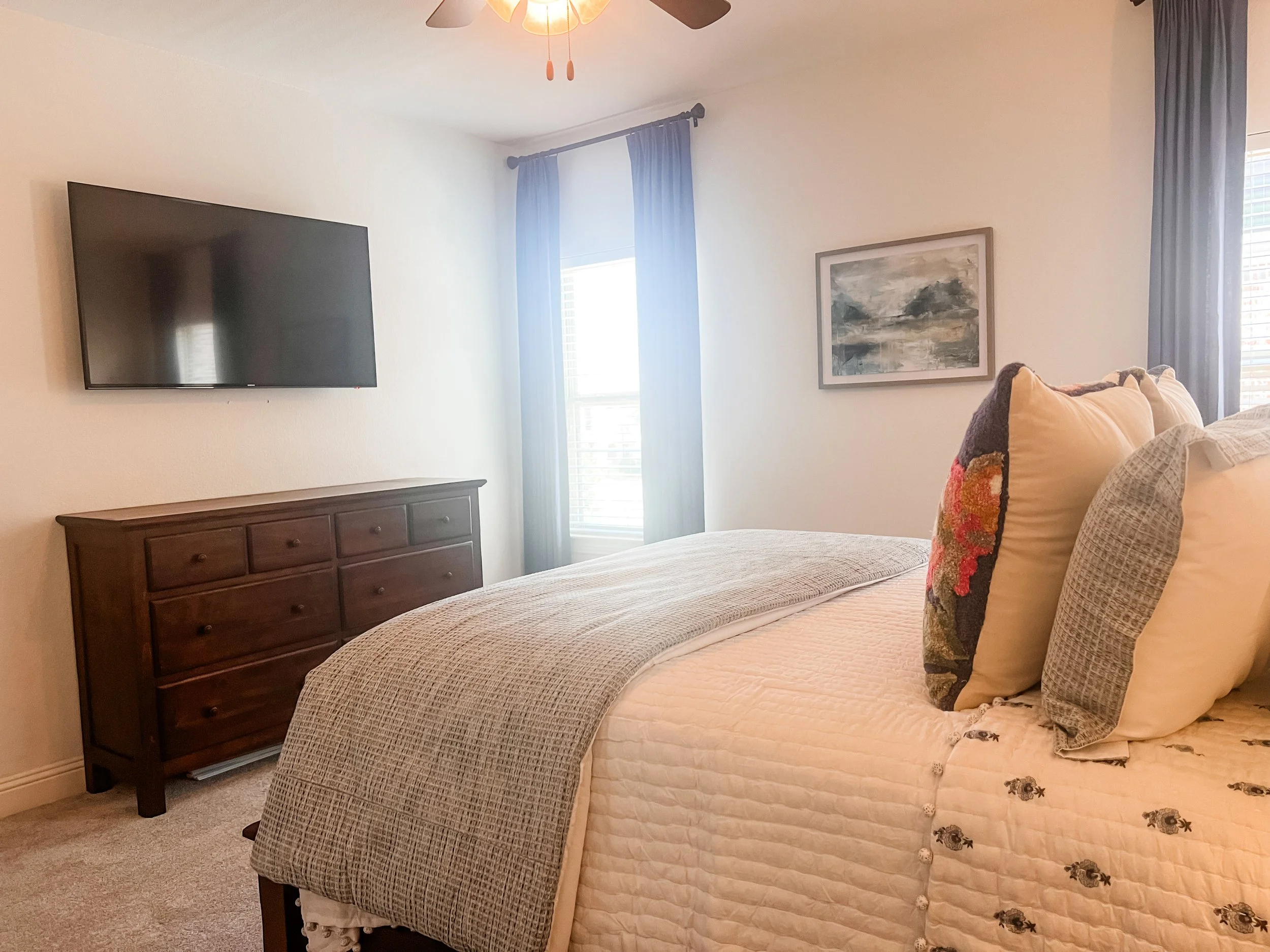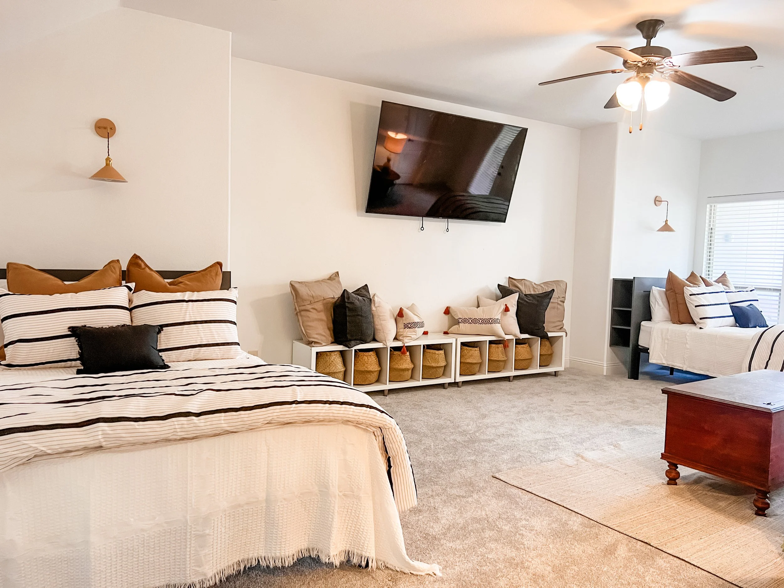 Primary bedroom, guest bedroom, guest suite with two full beds and entertainment space & home office